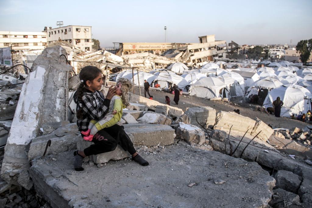 12月9日,在加沙地带加沙城,一名流离失所的女孩在一处临时帐篷区玩玩具。新华社发(马哈茂德·扎基摄)