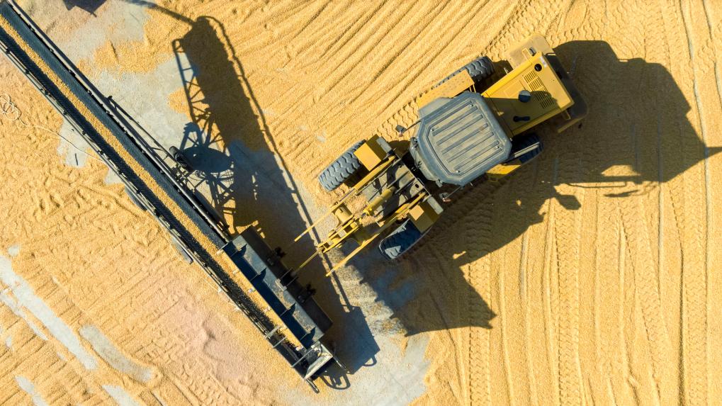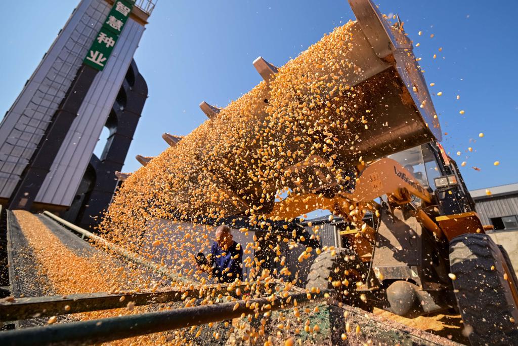 洛阳市宜阳县智慧农业制种基地,工作人员驾驶农机烘干收储玉米(10月15日摄)。