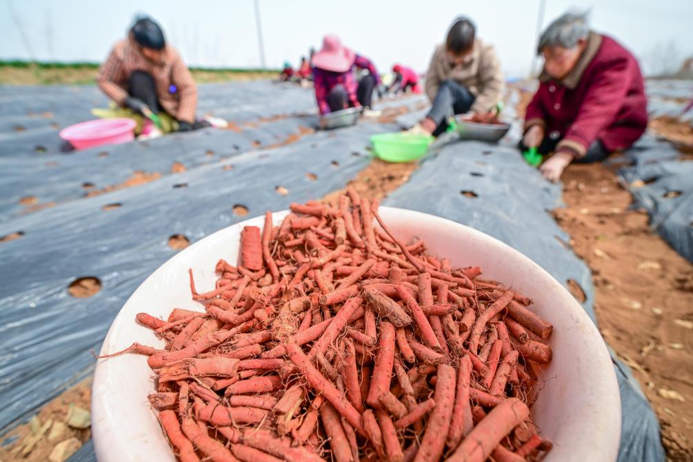 洛阳市嵩县田湖镇南安村丹参种植基地,农民在栽种丹参药材(3月16日摄)。