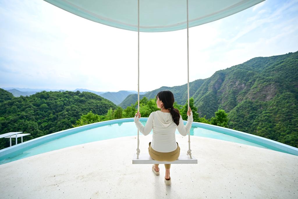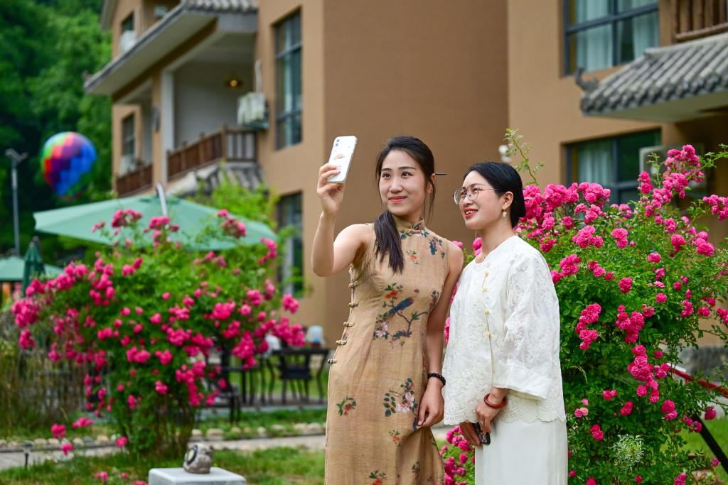 游客在洛阳市嵩县车村镇云裳小筑民宿游玩拍照(6月8日摄)。