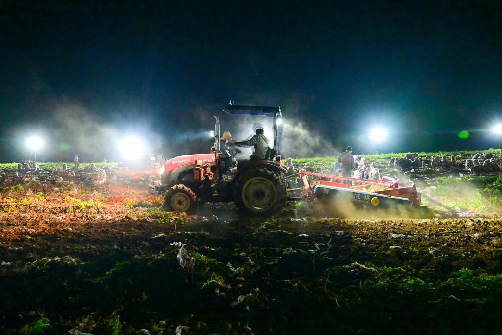 洛阳市宜阳县鲁村村千亩蔬菜基地,种植户在收获土豆(6月25日摄)。