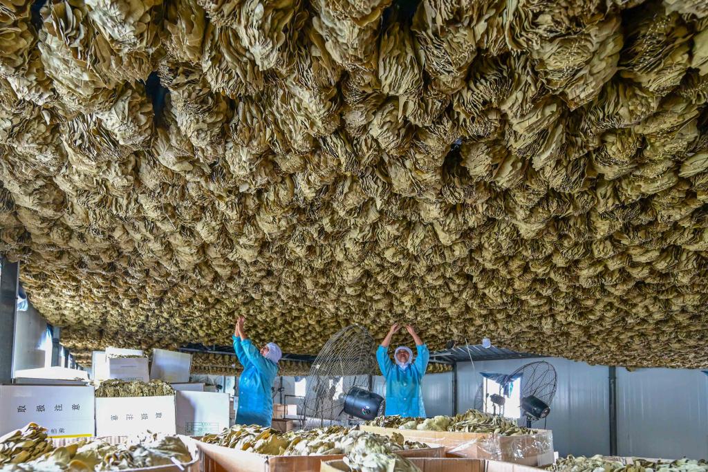 洛阳市嵩县车村镇一家槲叶加工厂,工人在挂槲叶(6月5日摄)。