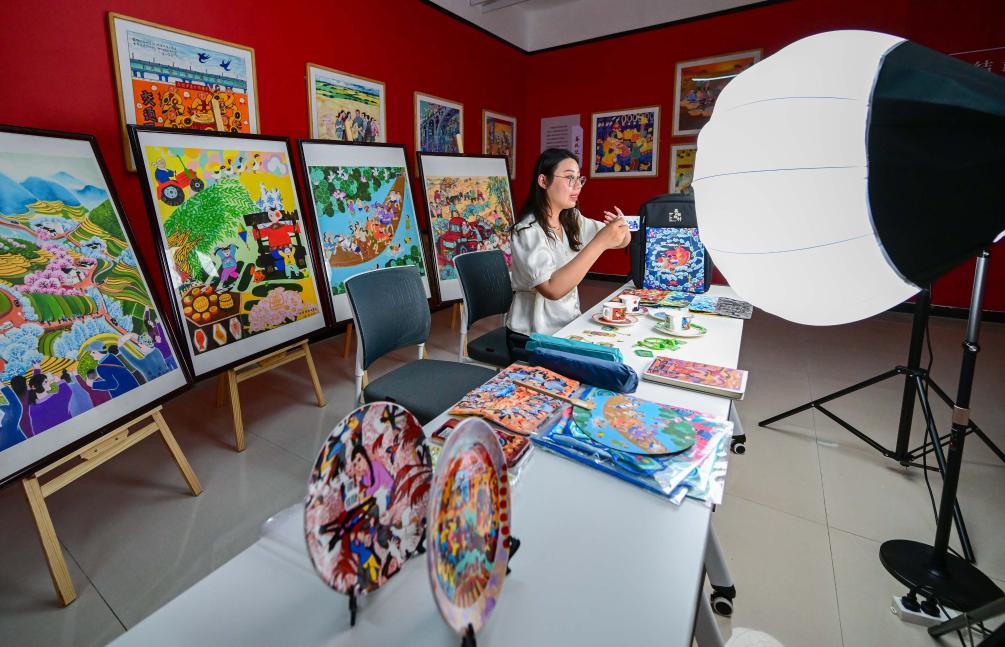 洛阳市偃师区翟镇镇甄庄村农民画研学实践中心,村民在直播销售文创产品(5月24日摄)。