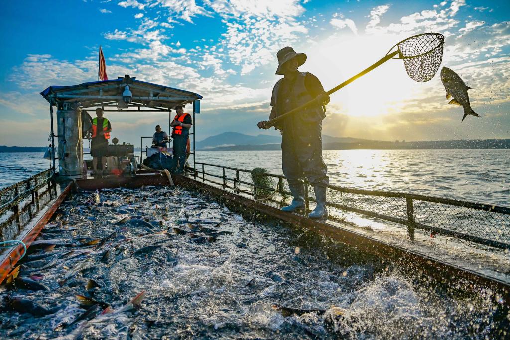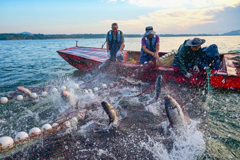 洛阳市嵩县陆浑湖,当地居民围网捕鱼(8月1日摄)。