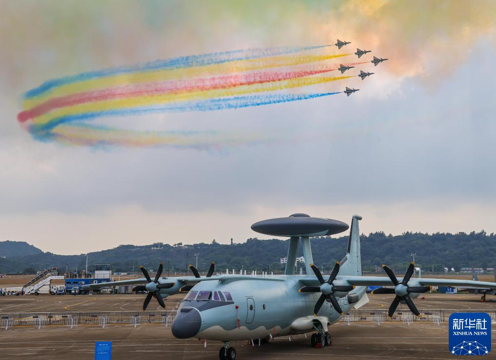 2024年11月11日,空军八一飞行表演队和空军航空大学“红鹰”飞行表演队展翅珠海,以独特的方式庆祝中国人民解放军空军成立75周年。新华社记者 刘大伟 摄