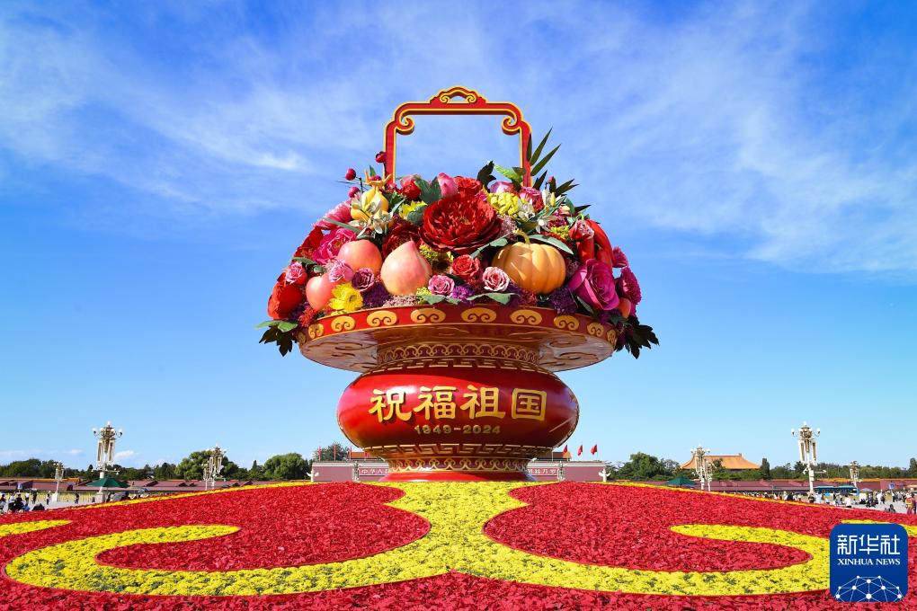 2024年9月25日拍摄的北京天安门广场“祝福祖国”巨型花篮。新华社记者 陈钟昊 摄