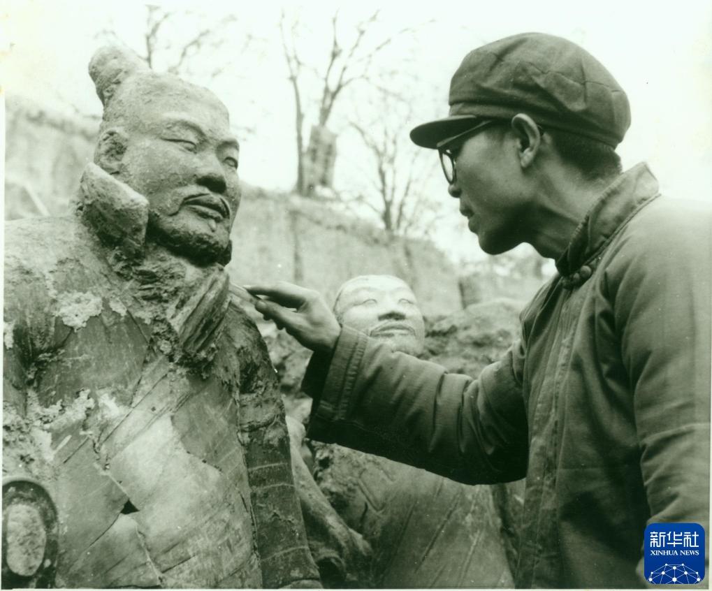 1974年,时任秦始皇兵马俑考古队领队的袁仲一在陕西西安兵马俑一号坑发掘现场进行文物清理工作。新华社发