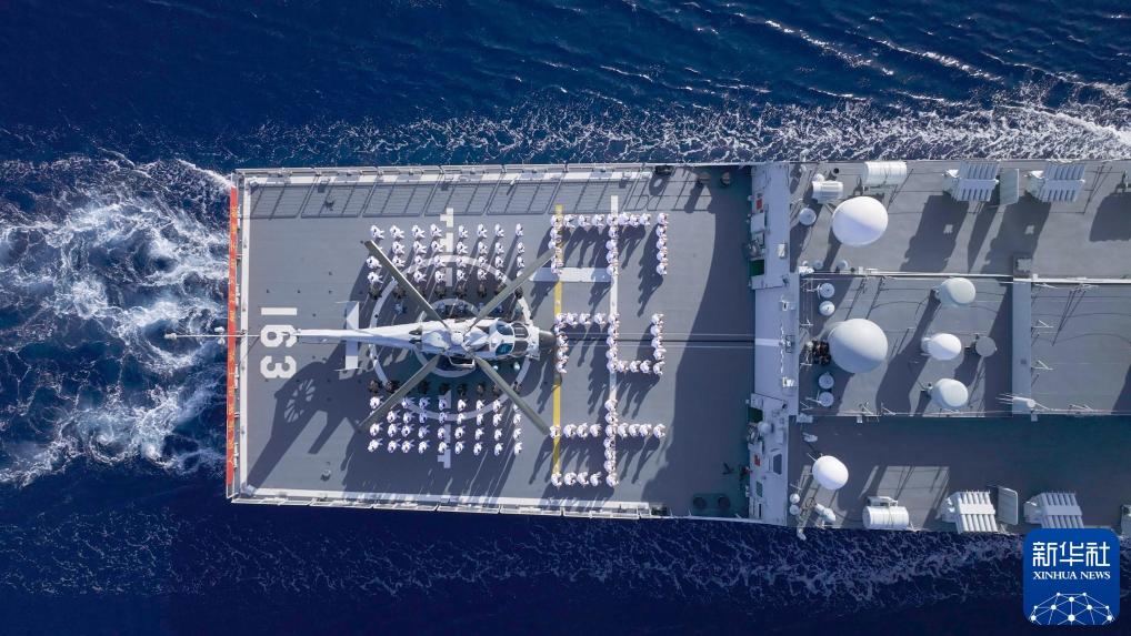 海军第46批护航编队摆出“423”字样庆祝人民海军成立75周年(2024年4月19日摄,视频截图)。新华社发(张大禹 摄)
