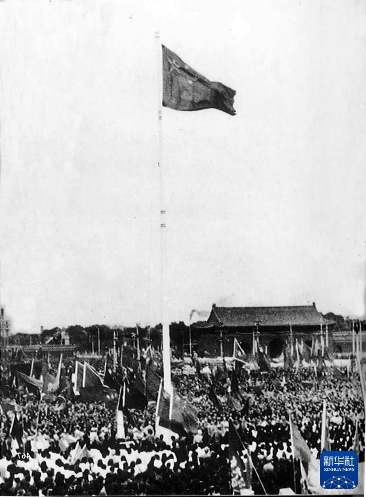 1949年10月1日,中华人民共和国成立。在开国大典会场上,第一面五星红旗冉冉升起,迎风飘扬。新华社发