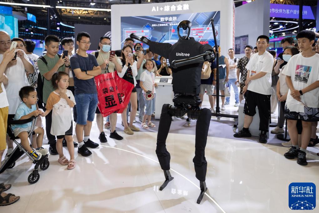 2024年7月6日,在2024世界人工智能大会,人们观看宇树科技通用人形机器人Unitree H1表演“科目三”舞蹈。新华社记者 王翔 摄