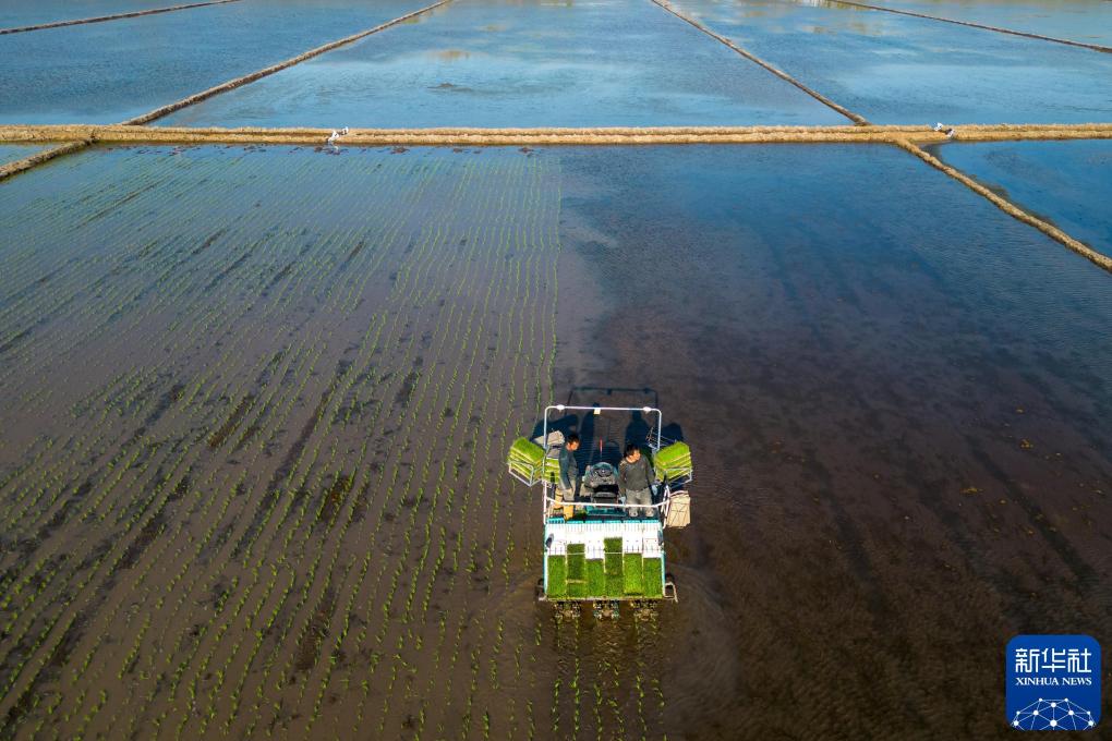 2024年5月8日,在北大荒集团前哨农场有限公司,农民在装配有北斗导航辅助直行系统的高速插秧机上进行水稻插秧作业。新华社记者 张涛 摄