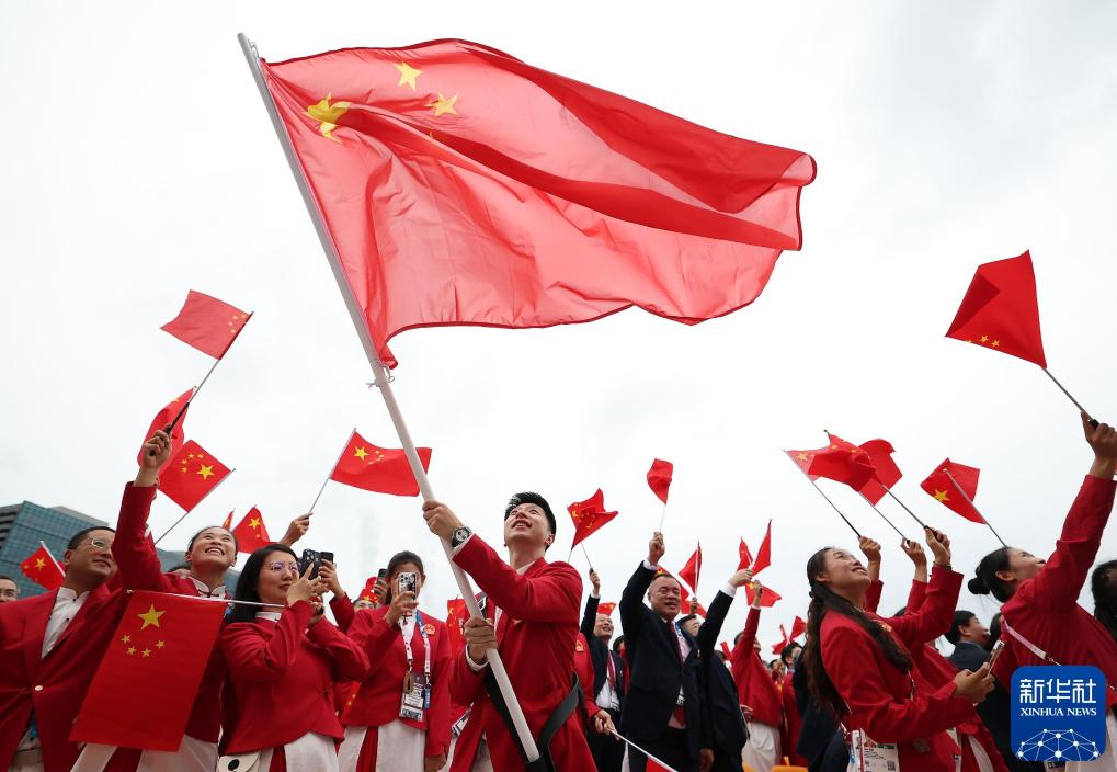 2024年7月26日,中国体育代表团旗手、乒乓球选手马龙在第33届夏季奥林匹克运动会开幕式前挥舞国旗。新华社记者 曹灿 摄