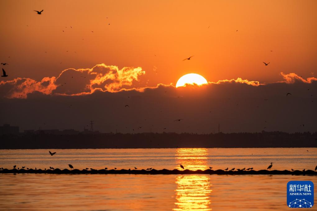 这是2024年1月1日在云南省昆明市滇池边拍摄的日出。新华社记者 胡超 摄
