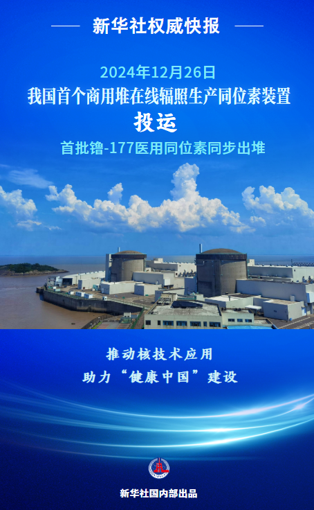 新华社杭州12月26日电(记者高敬、宋晨)12月26日,我国首个商用堆在线辐照生产同位素装置在中核集团秦山核电基地正式投运,在此生产的首批镥-177医用同位素也同步出堆。这对助力“健康中国”建设、推动我国核技术应用具有深远意义。