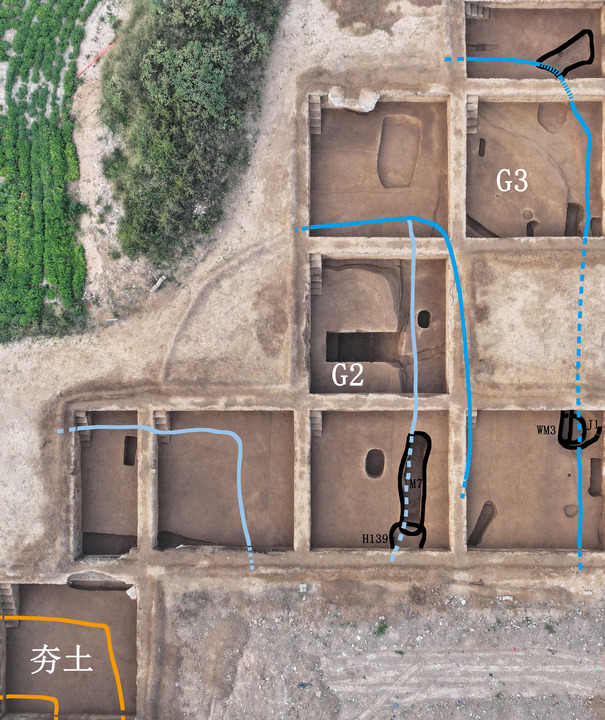 古城村遗址位于二里头遗址北侧的洛河北岸。2021年以来,洛阳市考古研究院与中国社会科学院考古研究所对古城村遗址联合开展考古工作,已发现二里头文化时期的3条壕沟(G1、G2、G3)和1道夯土墙。