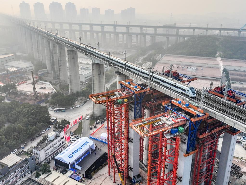 12月27日,在新建成渝中线下穿沪蓉线“托梁换柱”施工作业现场,一列高铁列车从沪蓉线新井口嘉陵江特大桥上驶过。新华社记者 唐奕 摄