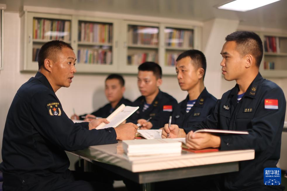 海军导弹驱逐舰海口舰技师周帅(左)利用训练间隙在舰艇餐厅带领班成员学习党的创新理论(2024年6月19日摄)。新华社发(杨云翔 摄)