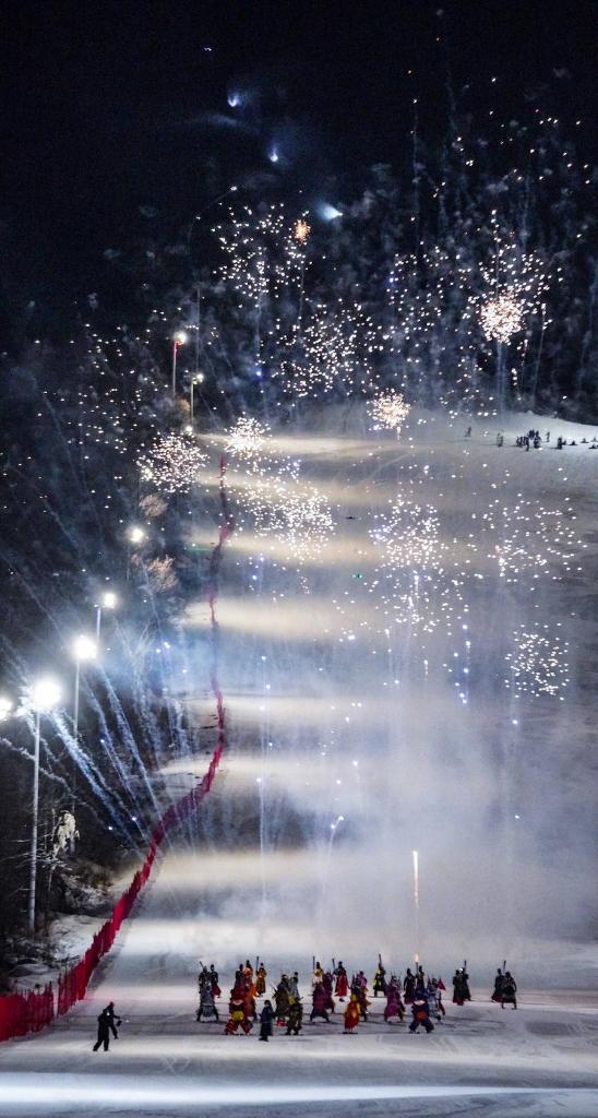 ↑2024年12月19日,表演者在第二届世界寒地冰雪经济大会进行夜滑表演。