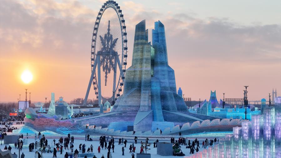 ↑12月21日,在哈尔滨冰雪大世界园区,游客在第九届亚冬会会徽冰建旁游玩、拍照(无人机照片)。本届冰雪大世界以“冰雪同梦 亚洲同心”为主题,园区整体面积近100万平方米,总用冰用雪量30万立方米。