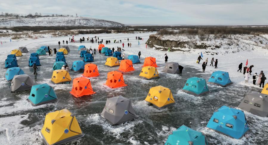 ↑12月22日,游客在内蒙古自治区额尔古纳市体验冰钓(无人机照片)。