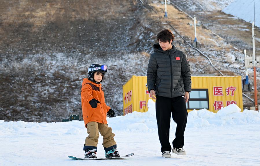 ↑2024年11月12日,全冬会自由式滑雪公开组男子大跳台比赛冠军杨昊(右)在内蒙古呼伦贝尔扎兰屯市金龙山滑雪场指导“萌娃”郑果滑雪。