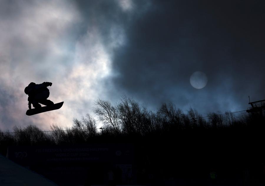 ↑2024年12月6日,2024国际雪联单板滑雪U型场地技巧世界杯崇礼站女子组资格赛在河北张家口崇礼云顶滑雪公园举行。图为中国选手邱冷在资格赛中。