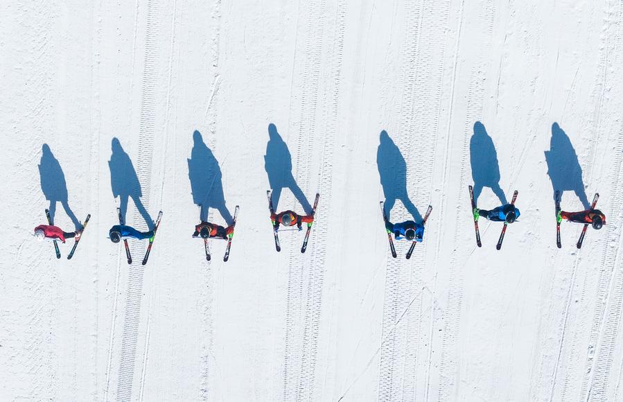 ↑2024年11月23日,滑雪爱好者在位于吉林市冰雪经济高质量发展试验区的北大湖滑雪度假区内滑雪(无人机拍摄)。