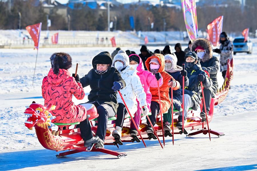 ↑2024年12月21日,人们在内蒙古呼伦贝尔的城市越野滑雪公园参加冰上龙舟比赛。
