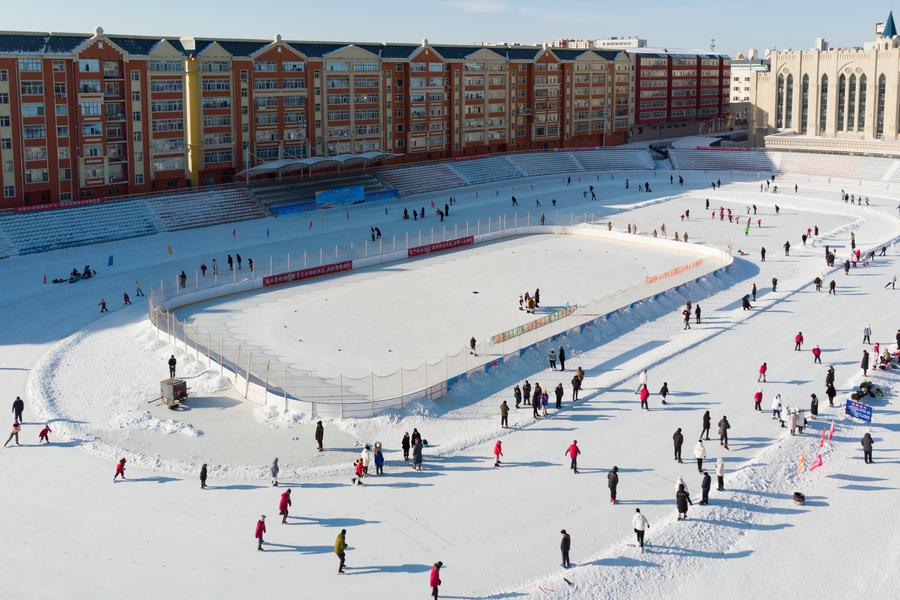 ↑2024年1月31日,市民在黑龙江省黑河市全民健身中心的冰场上滑冰(无人机照片)。