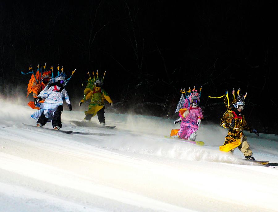 ↑2024年12月12日,身穿京剧服饰的俱乐部成员们在雪道上滑行。