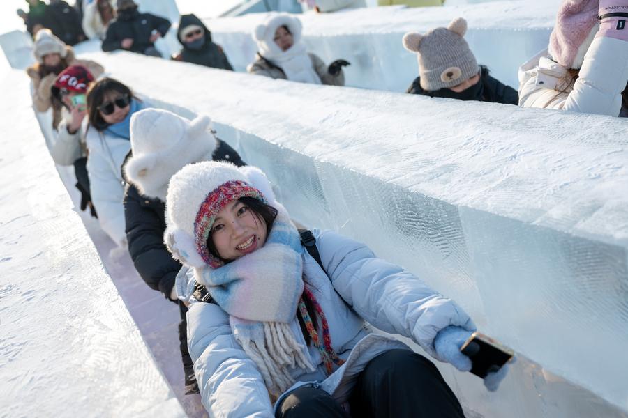 ↑2024年12月21日,游客在哈尔滨冰雪大世界园区内玩滑梯。