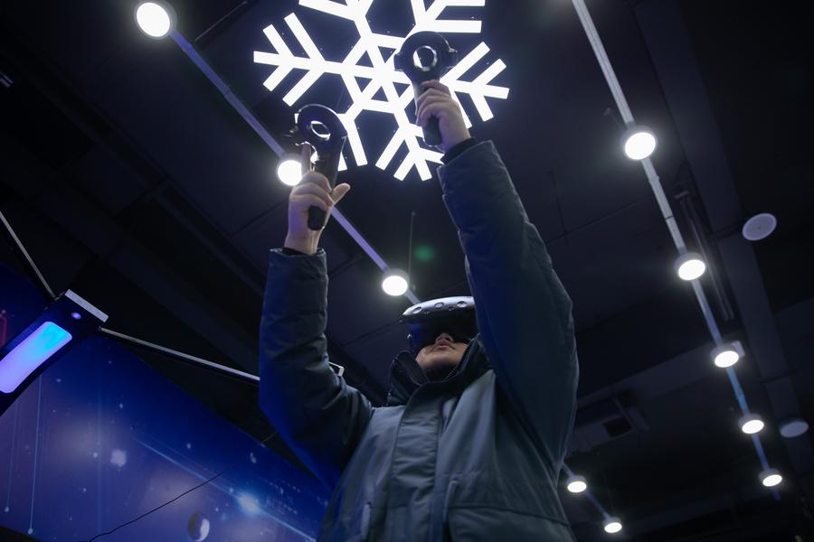↑2023年2月12日,游客在哈尔滨冰雪大世界园区内的冰雪元宇宙体验中心体验虚拟现实(VR)滑雪。