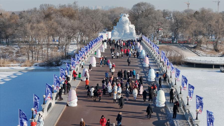 ↑2024年12月23日,人们在第37届太阳岛国际雪雕艺术博览会上游览(无人机照片)。本届雪博会计划建设赛事及艺术雪雕260余处,总用雪量15万立方米。园区深度融合国风元素,重点打造6个主题景观区和雪人IP秀、雪趣研学营2个拓展区。