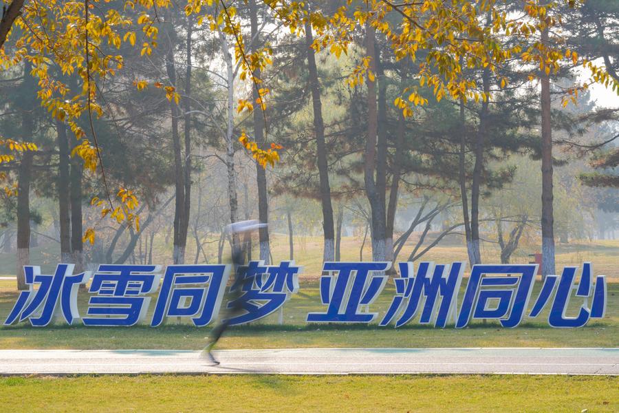 ↑2024年10月30日,在哈尔滨市湘江公园,市民跑步经过亚冬会主题景观。