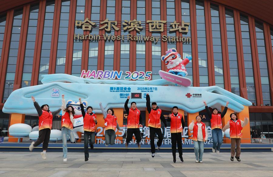 ↑2024年10月30日,在哈尔滨西站,志愿者在亚冬会标识前合影。