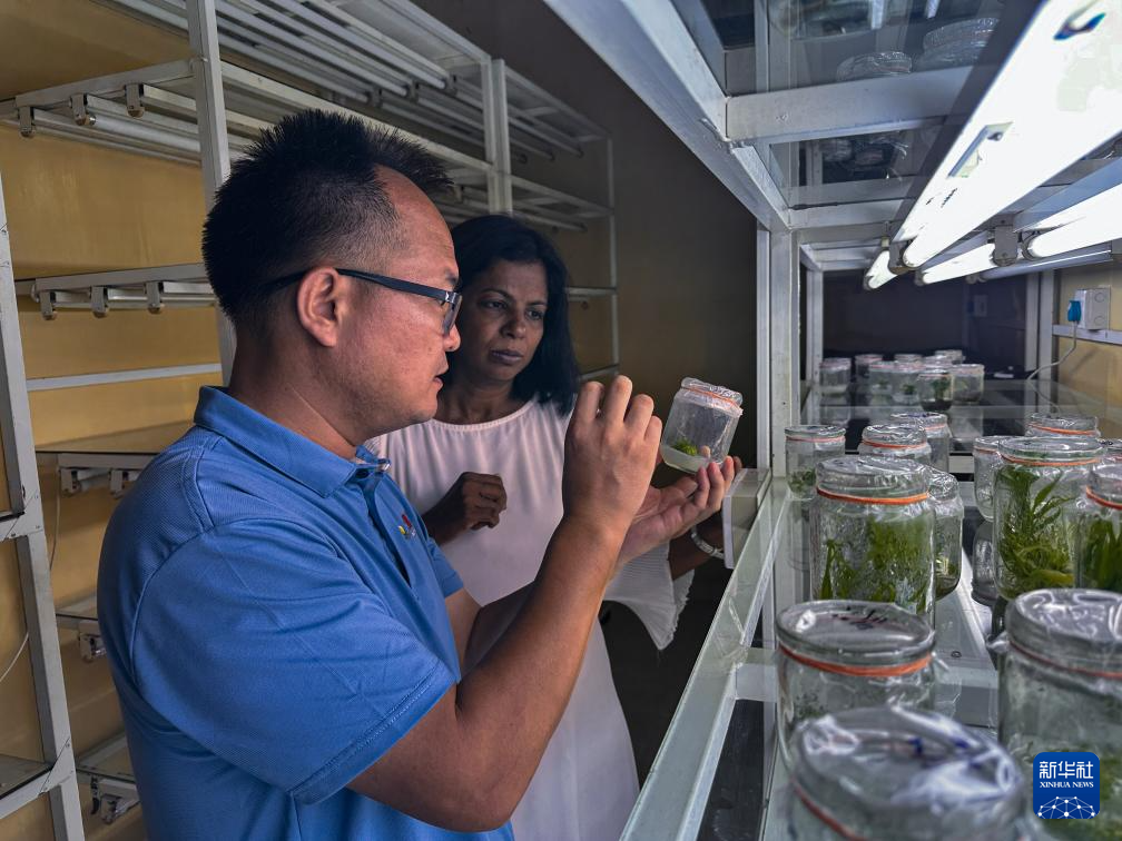 12月23日,在斯里兰卡马坎杜拉,中国专家与斯里兰卡马坎杜拉可持续农业与发展研究中心主任达莎妮·贾亚曼纳交流。新华社发(中国、联合国粮农组织与斯里兰卡南南合作项目专家组供图)