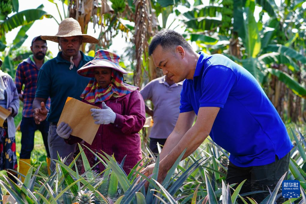 临近2024年末,斯里兰卡西北省马坎杜拉中国技术试验田里的菠萝和香蕉,经过一年蛰伏与生长,终于进入挂果期。在33摄氏度的高温里,中国热带农业科学院专家赵增贤指导当地农技人员学习果实套袋技术。