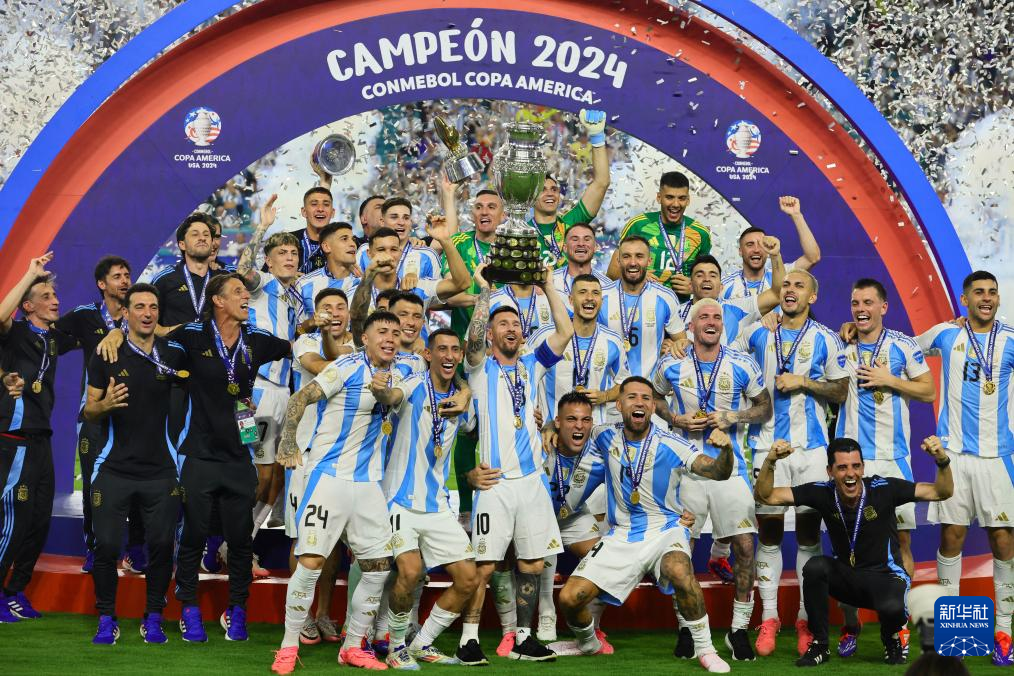 这是2024年7月14日,阿根廷队在2024美洲杯足球赛决赛后的颁奖仪式上庆祝夺冠。新华社发