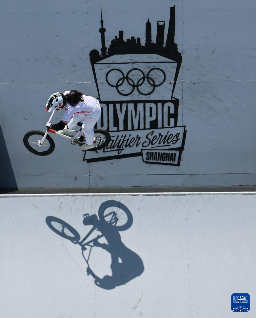 这是2024年5月18日,中国选手邓雅文在巴黎奥运会资格系列赛上海站小轮车自由式女子公园赛决赛中。新华社记者 王楷焱 摄