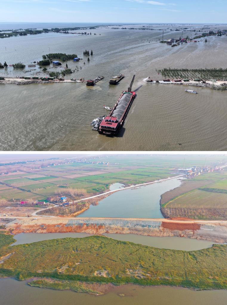 拼版照片:上图为7月8日拍摄的湖南省岳阳市华容县团洲垸洞庭湖大堤决口现场,抢险队伍在进行堵口作业(无人机照片);下图为12月18日拍摄的团洲垸洞庭湖大堤(无人机照片)。新华社记者 薛宇舸 摄