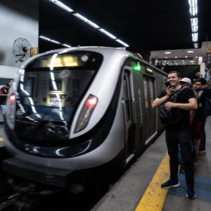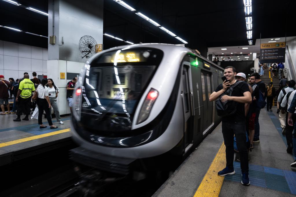11月13日,在巴西里约热内卢博塔弗戈地铁站,一辆由中车长春轨道客车股份有限公司制造的地铁列车驶入站台。新华社记者王天聪摄