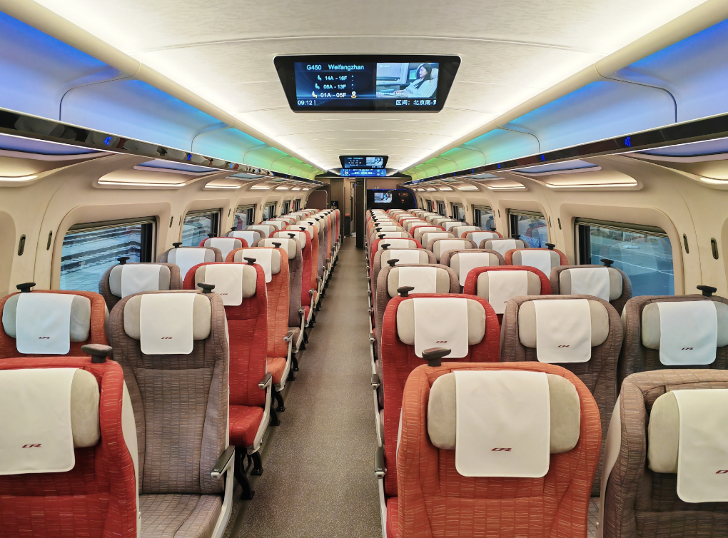 车厢内部可随室外环境自动调节亮度;每个座位都提供USB等充电设施;可提供多功能间、家庭包间、商务包间等多样选择……CR450动车组让旅途更舒适。