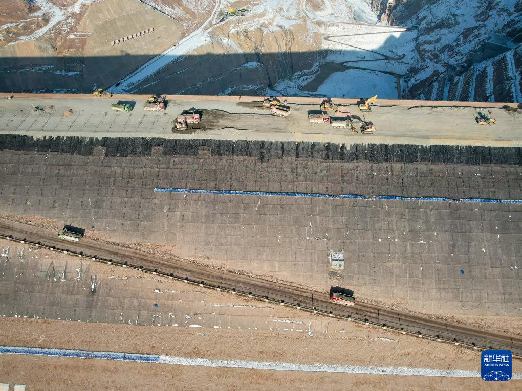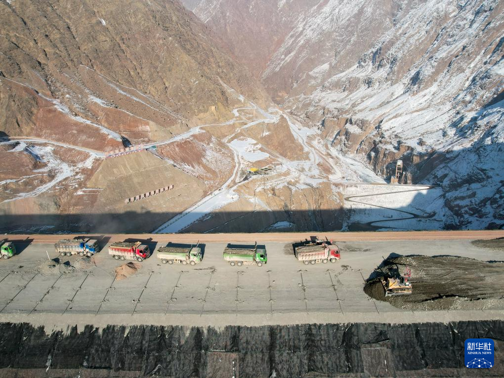 12月27日,工程车辆在新疆大石峡水利枢纽工程坝顶施工(无人机照片)。新华社发