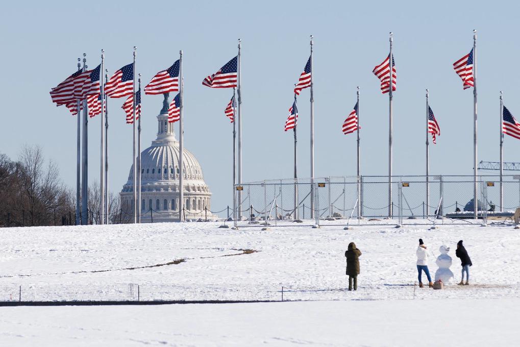 1月17日,人们在美国首都华盛顿雪后的国家广场游玩。新华社发(亚伦摄)