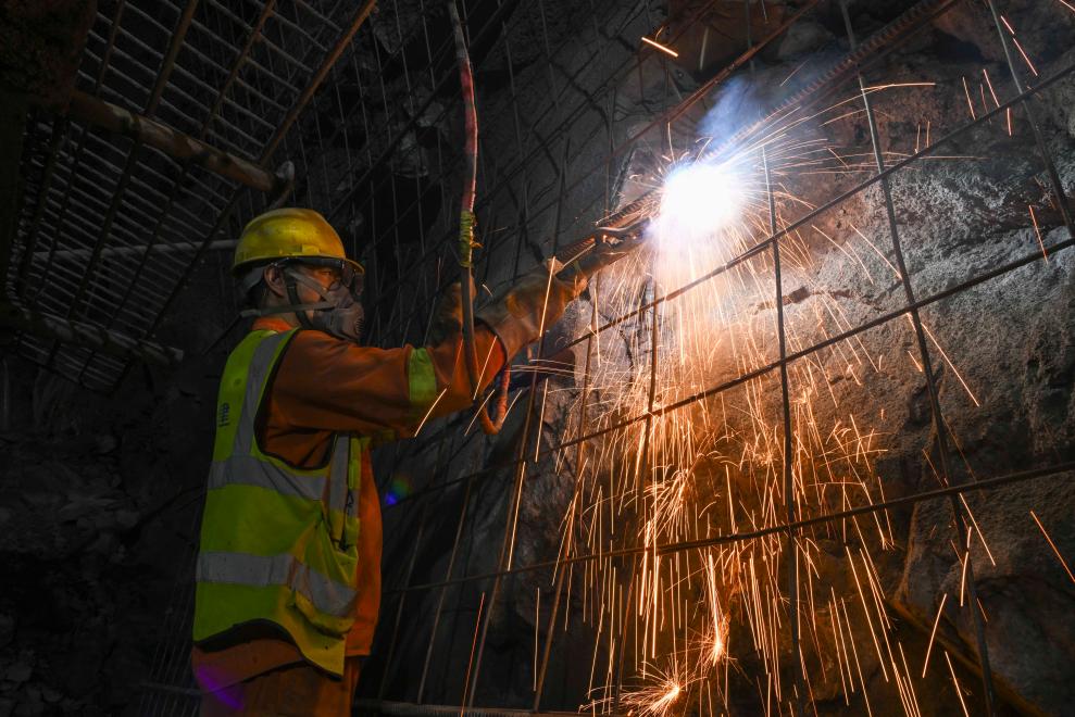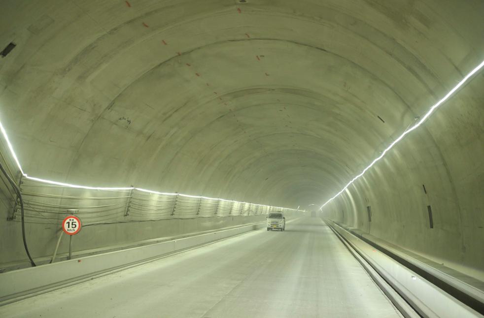 一段刚刚打通的隧道接口处,新固定的岩层还露出狰狞的粗粝;大型机械在远处操作,每一次动作都激起阵阵轰鸣……
