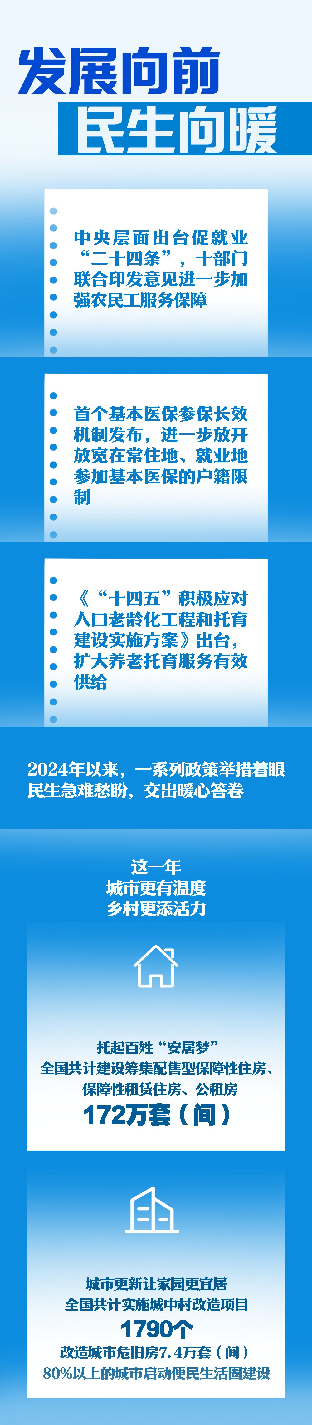 2024年以来,从中央层面出台促就业“二十四条”,到首个基本医保参保长效机制发布,再到聚焦“一老一小”领域扩大养老托育服务有效供给,一系列政策举措着眼民生急难愁盼,书写暖心答卷。