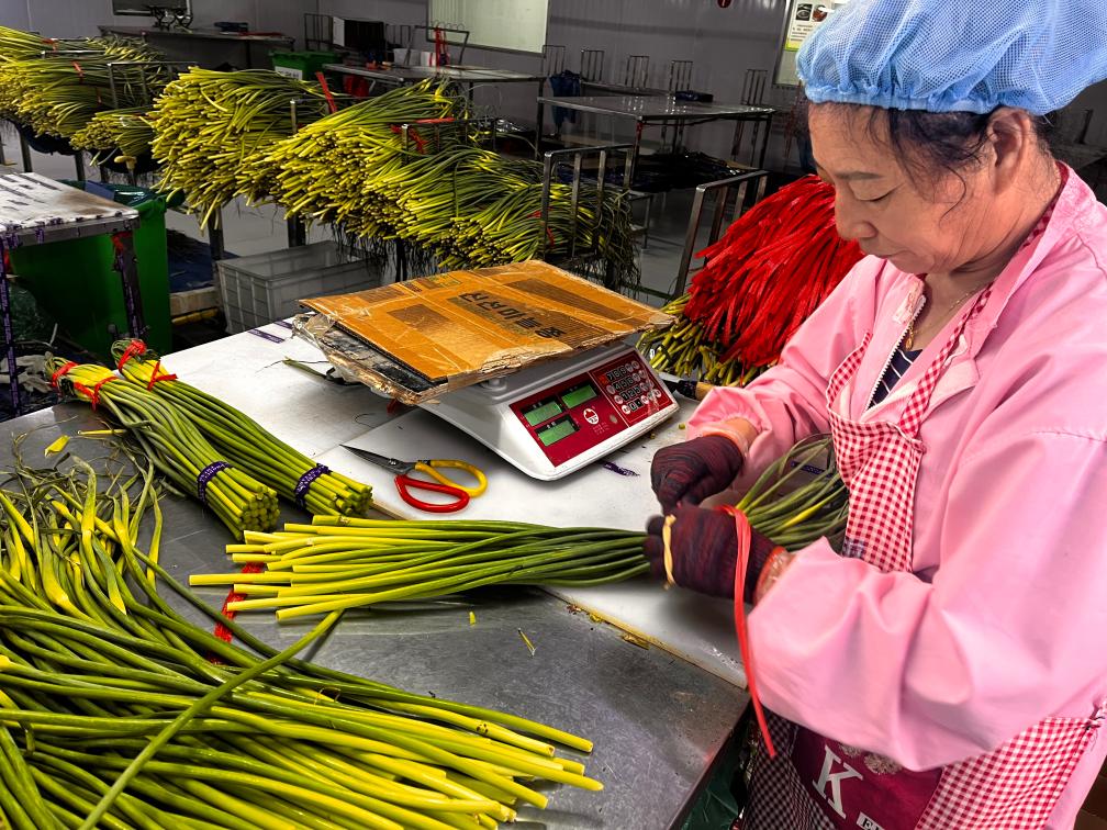 济南三兴食品有限公司拥有自主进出口资质,主要向韩国出口蒜薹等泡菜制品。“白桥镇对大蒜质量安全把控严格,符合出口质量安全标准,2024年我们销售蒜薹1200多吨,并提供了400多个就业岗位。”三兴食品公司总经理王永福说。