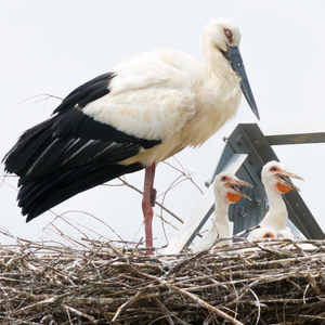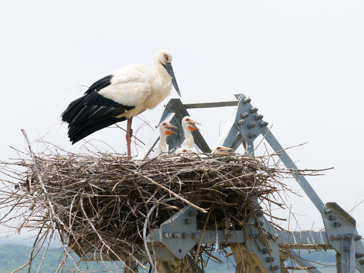 2023年4月29日,东方白鹳“塔生”和她的一大家子在江西进贤附近的电力铁塔上筑巢。(傅杰摄)