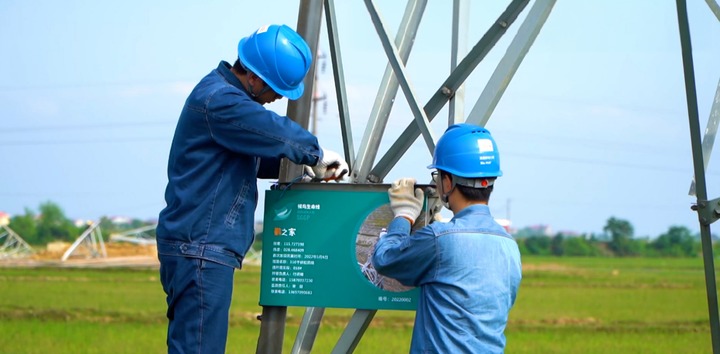 2023年4月29日,国网江西超高压公司检修人员在进贤附近的铁塔上安装在线监测装置,以便更好观测和保护东方白鹳。(傅杰摄)