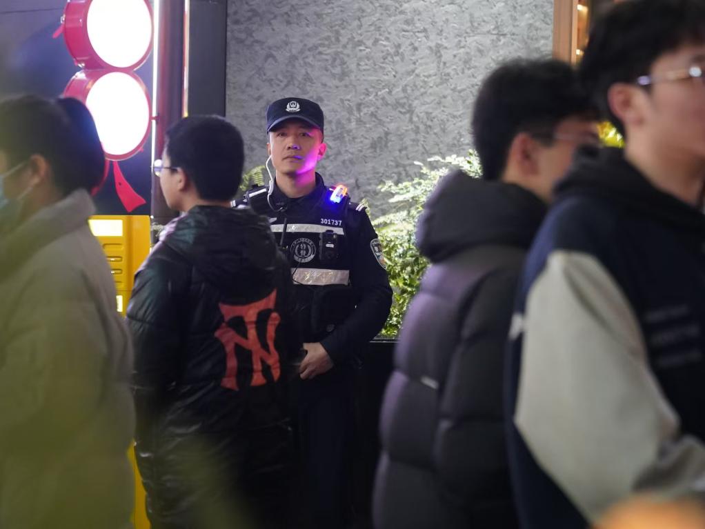 重庆市公安局渝中区分局特警支队执勤警察王雪莹与队友们并肩立于十字路口,仔细听取着耳机里传来的最新情况,这是他连续第13年在解放碑区域跨年值守。